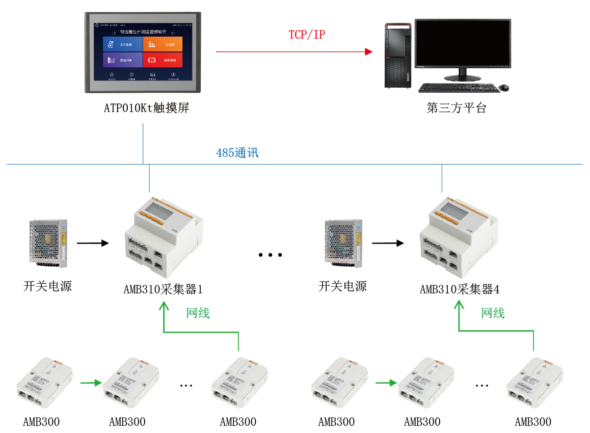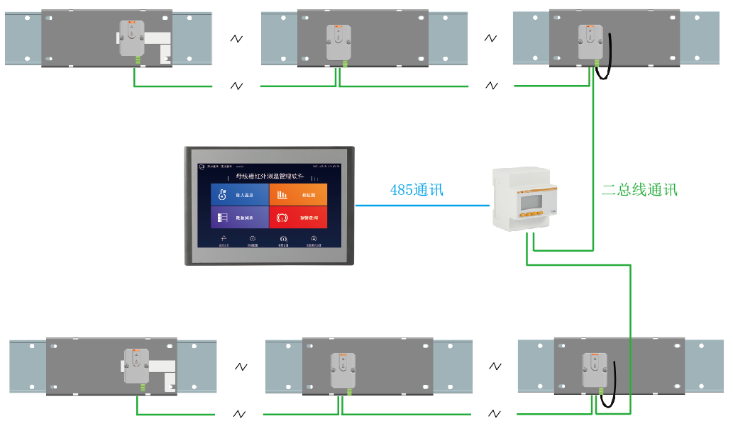 此母線槽紅外測溫解決方案由人機HMI觸摸屏,紅外測溫模塊,紅外采集器,電源模塊組成。該系統(tǒng)通過RS485線與本地觸摸屏進行通信,再有觸摸屏上傳數(shù)據至第三方平臺(如下圖),系統(tǒng)設計遵循國際標準Modbus-RTU傳輸規(guī)約,安全性、可靠性和開放性都得到了很大地提高。RS-485作為一種串行通信的接口具有傳輸距離長、速度較高、電平兼容性好、使用靈活方便、成本低廉和可靠度高等特點,與無線通信方式相比,具有價格低、抗共模干擾能力強等優(yōu)點。