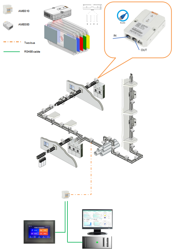 該項目共計16條母線槽,887個母線連接器,應用了我司AMB300系列母線槽紅外測溫解決方案,這是一款非接觸式紅外測溫裝置,該系統(tǒng)能夠解決母線槽安全測溫、測溫問題,實時把連接器中每相溫度數(shù)據上傳后臺,實行監(jiān)測、預警信息,提示管理人員應對報警點予以重視或采取必要的預防措施。