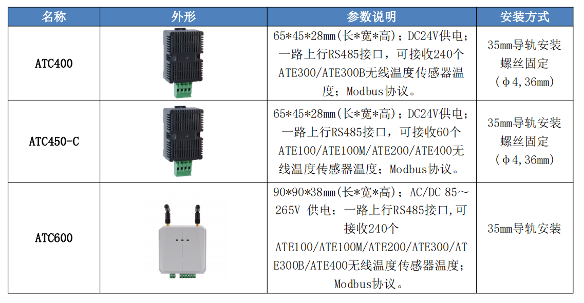 說明:ATC450-C 無線溫度收發(fā)器可連接 60 路無線溫度傳感器 ATE100/100M/200/400,可接收多臺柜內(nèi)的無