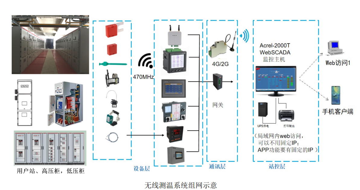 通訊連接配電室內(nèi)無線測溫相關就地顯示裝置實現(xiàn)集中顯示,同時還可以連接配電室內(nèi)智能操控、