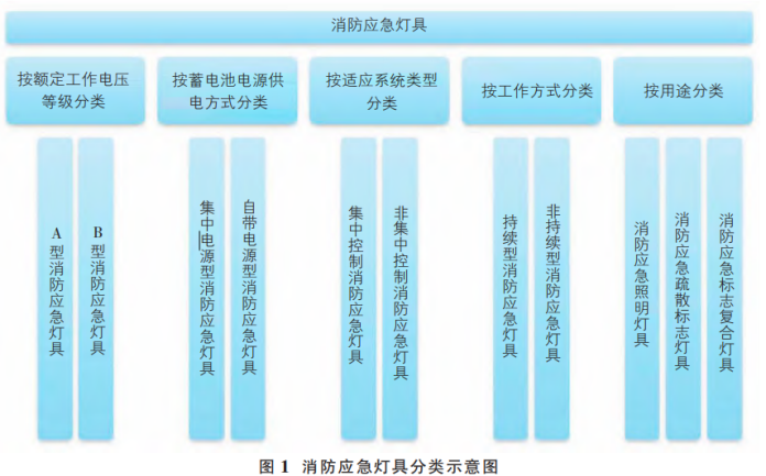 ④消防應(yīng)急燈具,為人員疏散、消防作業(yè)提供照明和指示標志的各類燈具,包括消防應(yīng)急照明燈具和消防應(yīng)急標志燈具。消防應(yīng)急燈具根據(jù)使用場所和功能需求不同分類,如圖1。系統(tǒng)按照明分類分為:疏散照明、疏散指示和消防備用照明。
