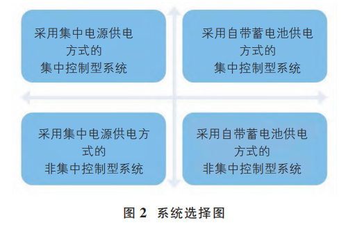 火災(zāi)時由火災(zāi)自動報警及聯(lián)動控制系統(tǒng)聯(lián)動斷開正常電源,由燈具產(chǎn)品自帶的蓄電池為其供電以及應(yīng)急點亮。當(dāng)住宅小區(qū)交付使用后,消防燈具產(chǎn)品存在質(zhì)量差異和一定的使用壽命,若要維持其可靠性,則需要物業(yè)管理人員經(jīng)常巡查、維護和更換新產(chǎn)品。成為住宅小區(qū)物業(yè)管理的一項人力成本較大的投入?!都夹g(shù)標準》實施后,住宅建筑中的消防應(yīng)急照明系統(tǒng)的設(shè)計與以往做法存在了很大的差異?!都夹g(shù)標準》明確了設(shè)置消防控制室的場所,其消防應(yīng)急照明系統(tǒng)采用集中控制型;若設(shè)置了火災(zāi)自動報警系統(tǒng)但無需設(shè)置消控室的場所,則宜選擇設(shè)置集中控制型系統(tǒng);其他場所,則可選擇設(shè)置非集中控制型系統(tǒng)。根據(jù)消防應(yīng)急燈具蓄電池供電方式的不同,可分為燈具采用集中電源的供電方式和燈具采用自帶蓄電池的供電方式兩種。系統(tǒng)的兩種控制方式和燈具蓄電池電源供電的兩種方式,可兩兩組合成為不同的系統(tǒng)。如圖2所示。