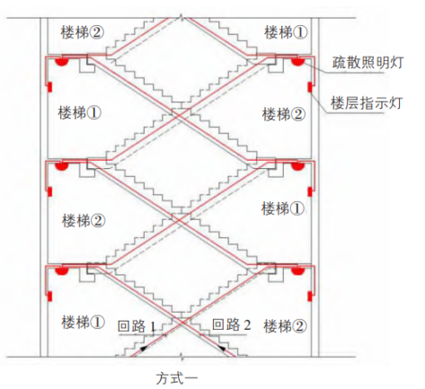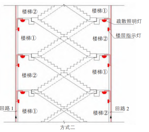燈具采用集中電源供電,集中電源為燈具的主電源和蓄電池電源供電,在集中電源內(nèi)部為燈具主電源與蓄電池電源實現(xiàn)輸出轉(zhuǎn)換后,由同一配電回路為燈具供電。集中電源的輸入及輸出回路中,均不裝設(shè)剩余電流動作保護器,輸出回路嚴禁接入系統(tǒng)以外的插座、開關(guān)裝置以及其他負載。燈具配電回路設(shè)計應(yīng)符合《技術(shù)標準》第3.3.3~3.3.6條的相關(guān)要求。住宅建筑的地上樓梯間,設(shè)置剪刀樓梯作為其兩個獨立的疏散樓梯很常見。剪刀樓梯內(nèi)的應(yīng)急照明配電方式,筆者認為,可由兩個配電回路為兩個樓梯間交錯供電(以下簡稱“方式一”)。每一回路的配電管線均沿兩則墻體豎直方向暗敷設(shè),比每個樓梯一個獨立回路沿樓梯斜樓板暗敷設(shè)的方式(以下簡稱方式二),更容易施工和更節(jié)省工程量?!都夹g(shù)標準》第3.3.4條第1款的要求,防煙樓梯間、封閉樓梯間應(yīng)單獨設(shè)置配電回路,初衷為樓梯間內(nèi)應(yīng)急照明免受其他區(qū)域影響,增加應(yīng)急照明的可靠性。但是筆者提出的方式一,則均為剪刀樓梯內(nèi)兩個獨立樓梯間提供雙回路供電,比方式二更可靠,哪怕其中一個回路有故障,每個獨立樓梯間內(nèi)均能保證50%的原設(shè)計照度,而方式二只有一個回路發(fā)生故障,則該樓梯間供電回路服務(wù)區(qū)域則失去了應(yīng)急照明。(圖3)集中電源、應(yīng)急照明控制器、集中控制型系統(tǒng)的控制以及系統(tǒng)線路設(shè)計,從《技術(shù)標準》實施至今,已形成了符合大多數(shù)住宅項目的設(shè)計原則,筆者不一一展開討論。