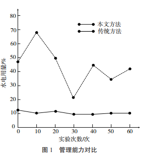 為了證明此次設(shè)計的系統(tǒng)具有實際應(yīng)用意義,同時為了保證實驗的嚴(yán)謹(jǐn)性,將該系統(tǒng)與傳統(tǒng)的校園管理方法進(jìn)行對比,主要對比管理后的水電用量情況。實驗時,保證同樣的用水用電情況,實驗對比結(jié)果如圖 1 所示。由圖 1 可知,使用傳統(tǒng)方法對高校水電情況進(jìn)行管理時,水電用量較大,而本文設(shè)計的高校水電情況管理系統(tǒng),水電用量較少。這是因為該系統(tǒng)能夠?qū)τ盟秒娗闆r進(jìn)行實時采集,并能對超出水電用量標(biāo)準(zhǔn)值的情況進(jìn)行報警提醒,減少了水電故障和浪費情況。