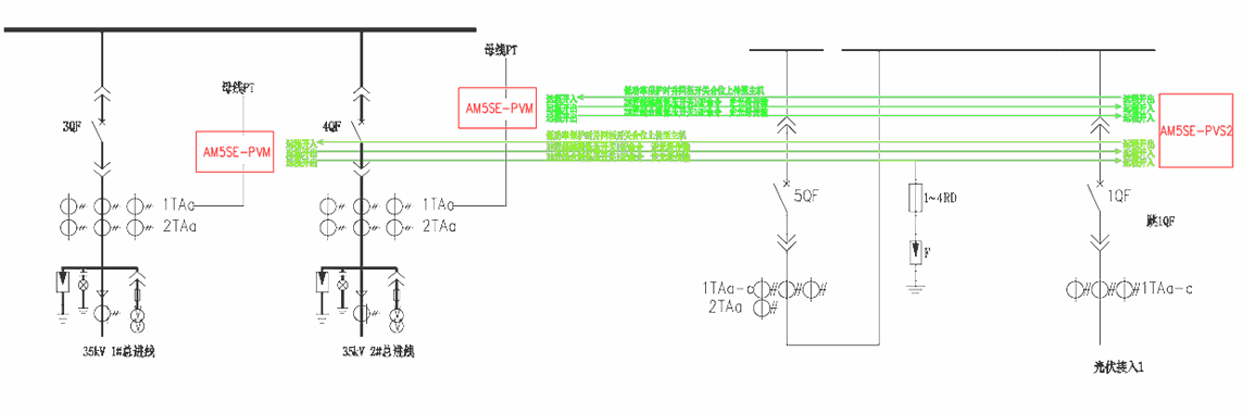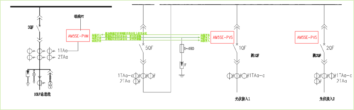 當光伏并網與市電側進線距離較遠可采用AM5SE-PV系列主從式防孤島保護裝置。